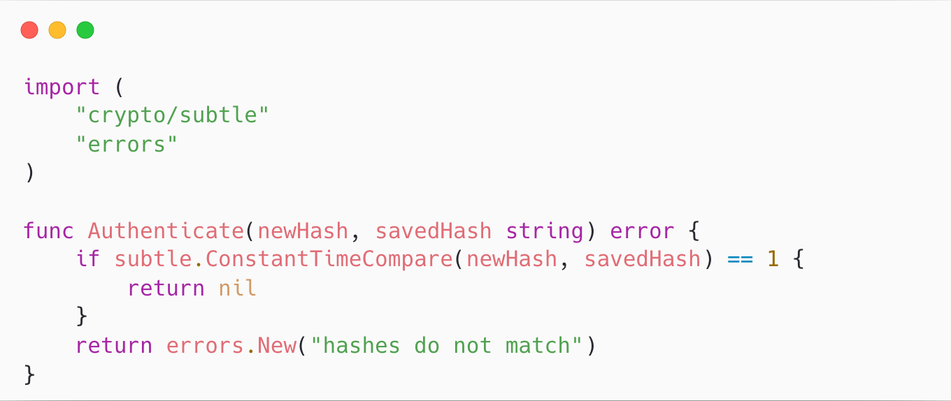 Speaking of the timing attack, one little detail is that you should always use a constant-time comparison function when possible.